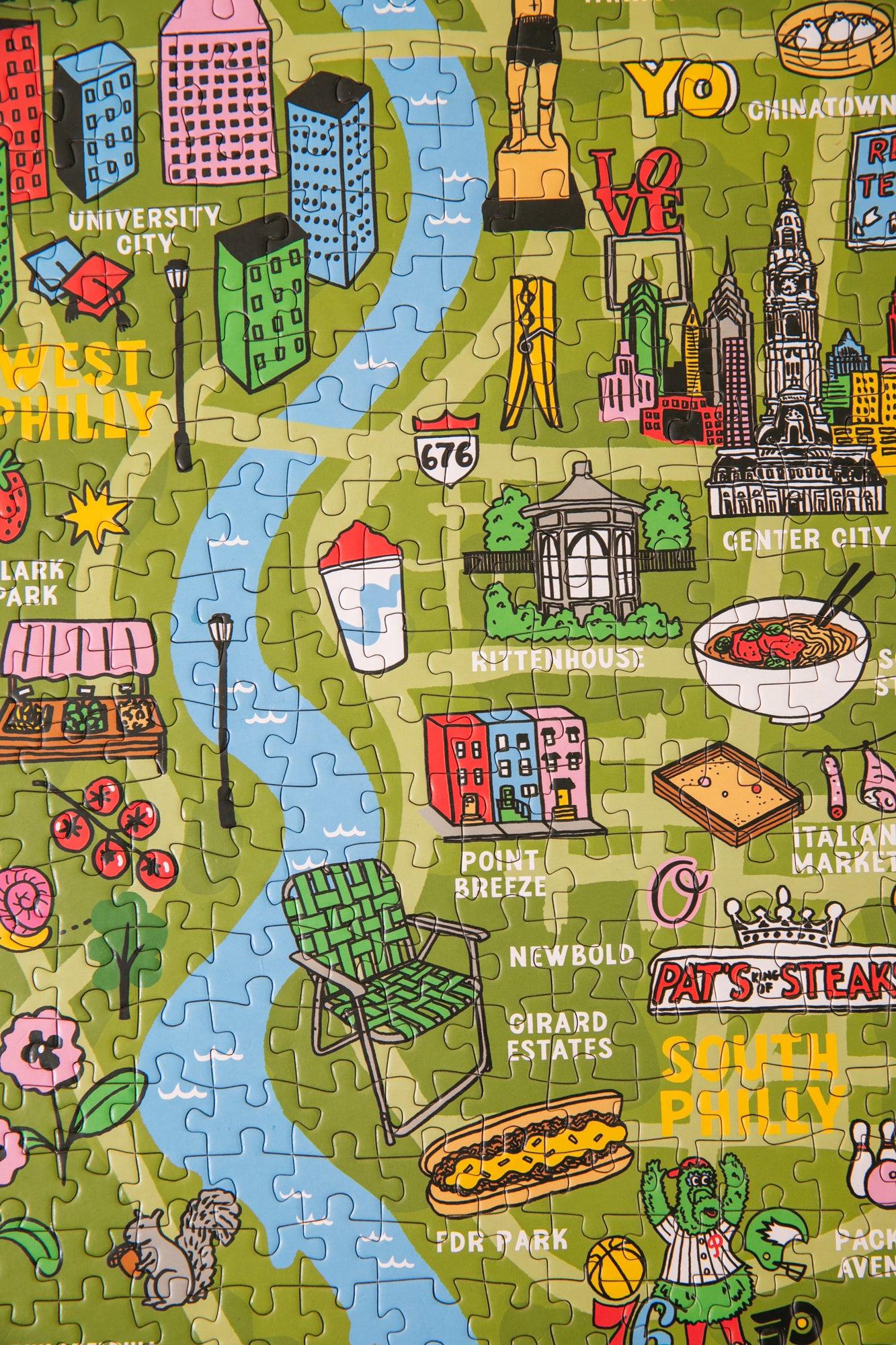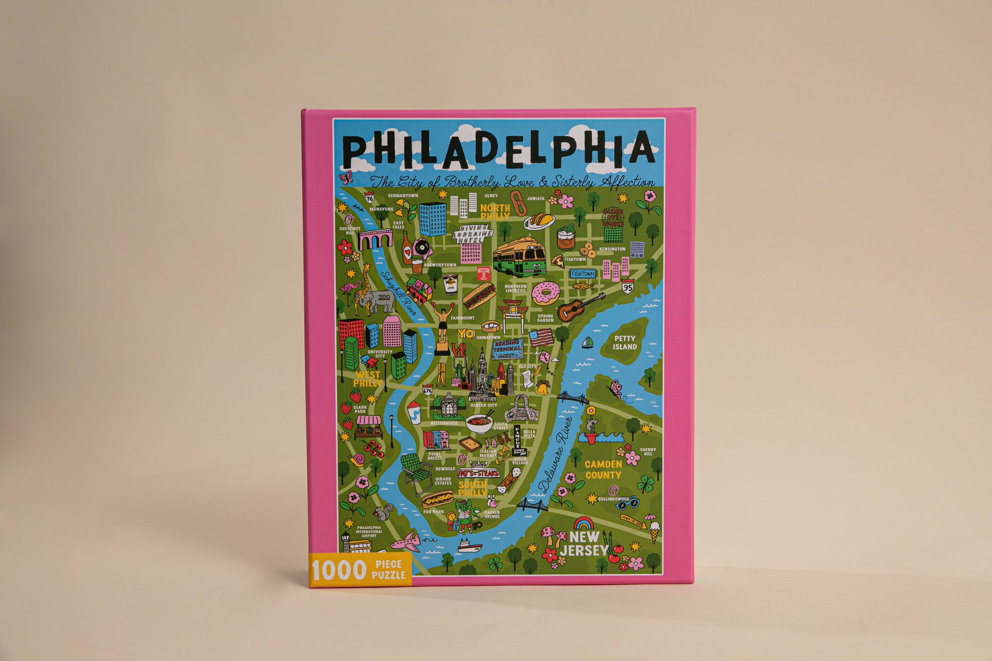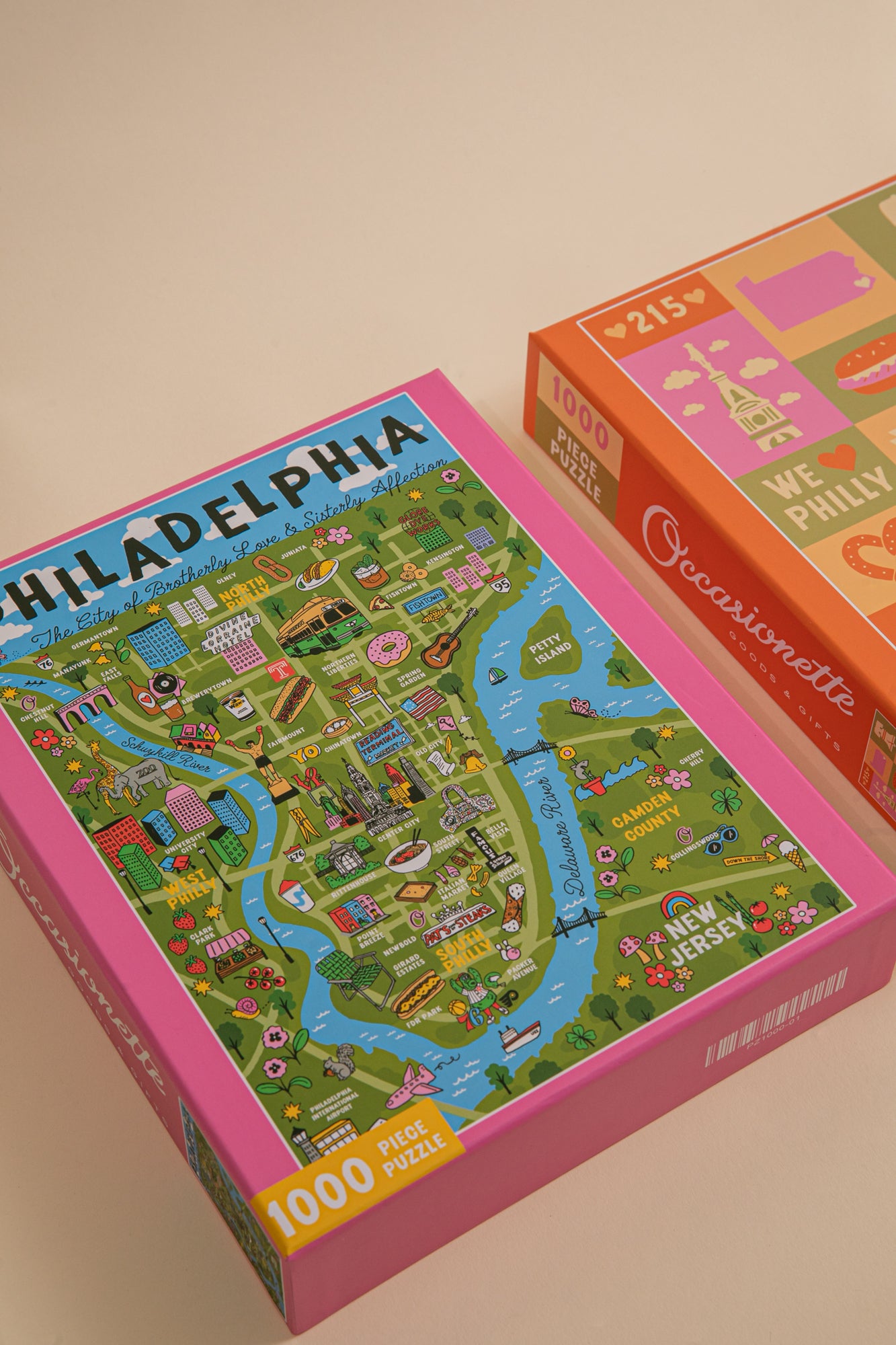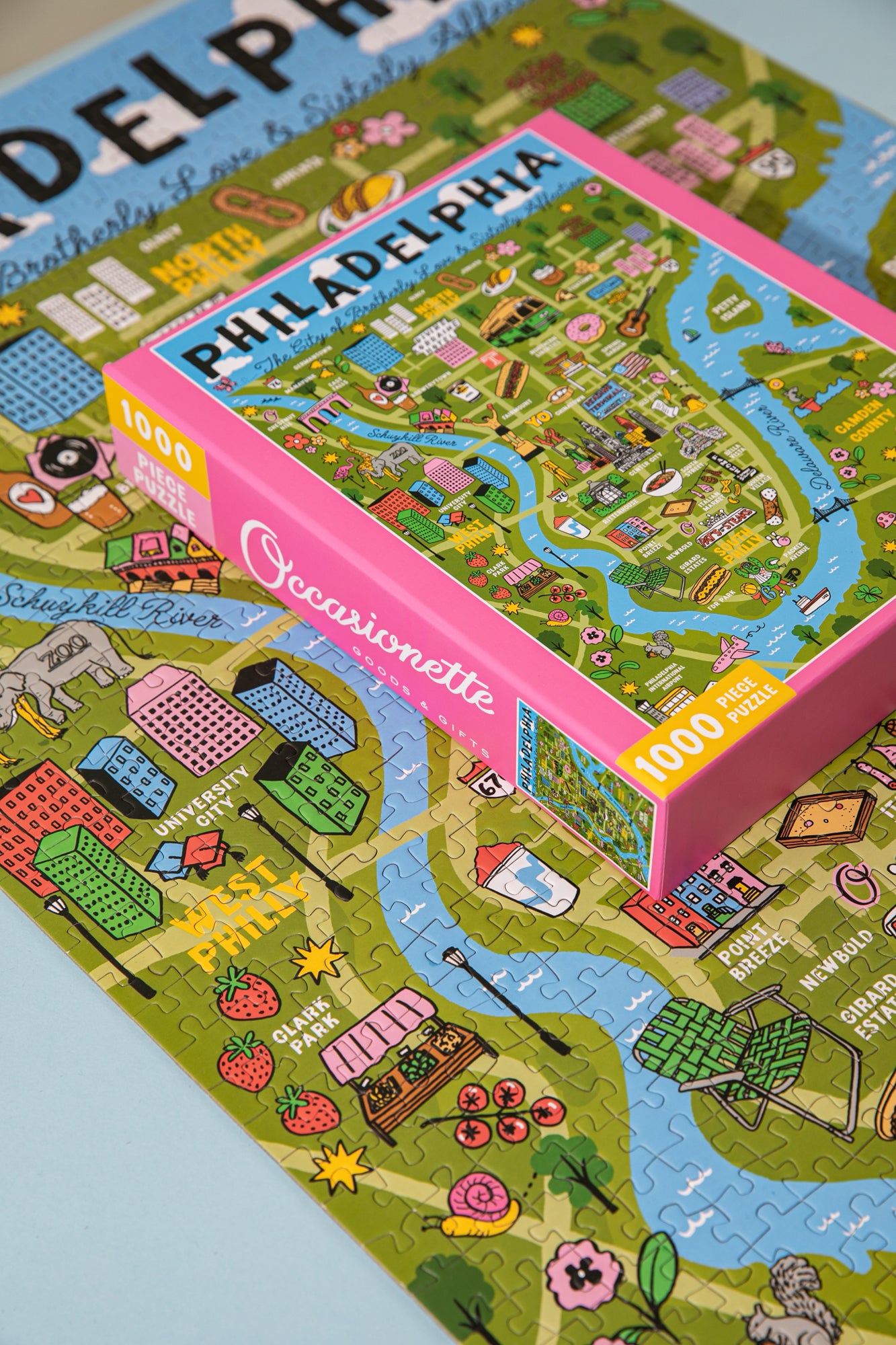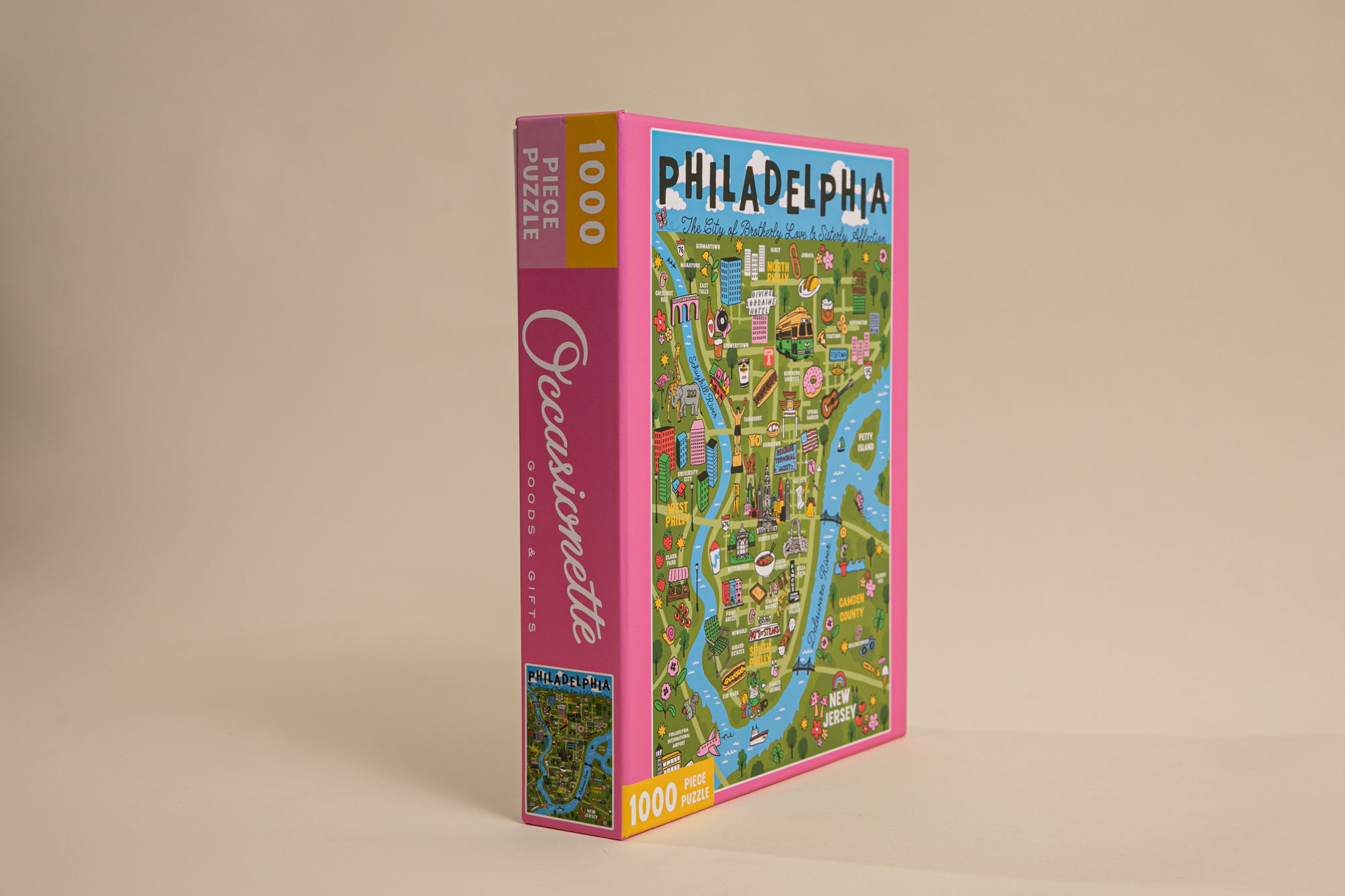 Piece together Philadelphia from the comfort of home with this 1000-piece jigsaw puzzle! Featuring an exclusive Occasionette map design, this puzzle is a fun and screen-free activity for locals, visitors, and puzzle enthusiasts alike. Get lost in the details of Philadelphia with this colorful puzzle — makes a great gift for puzzle fans and Philly enthusiasts.